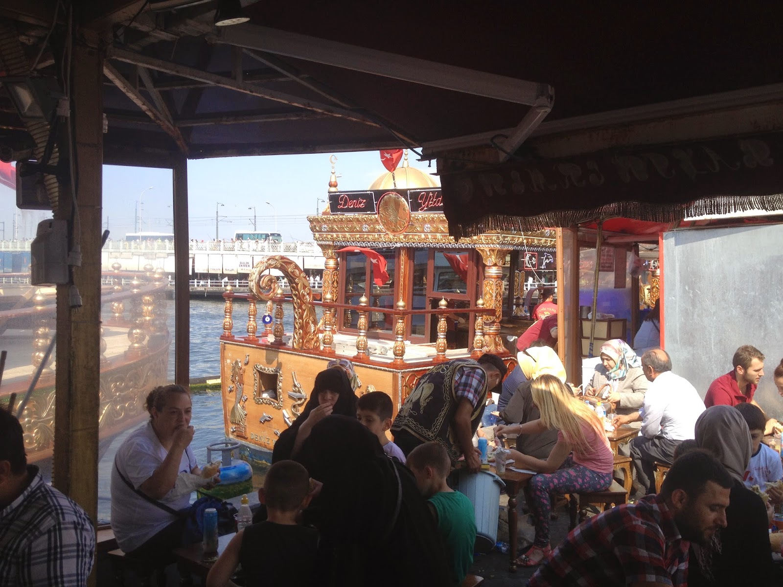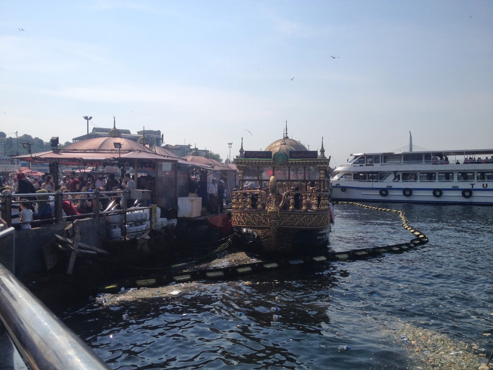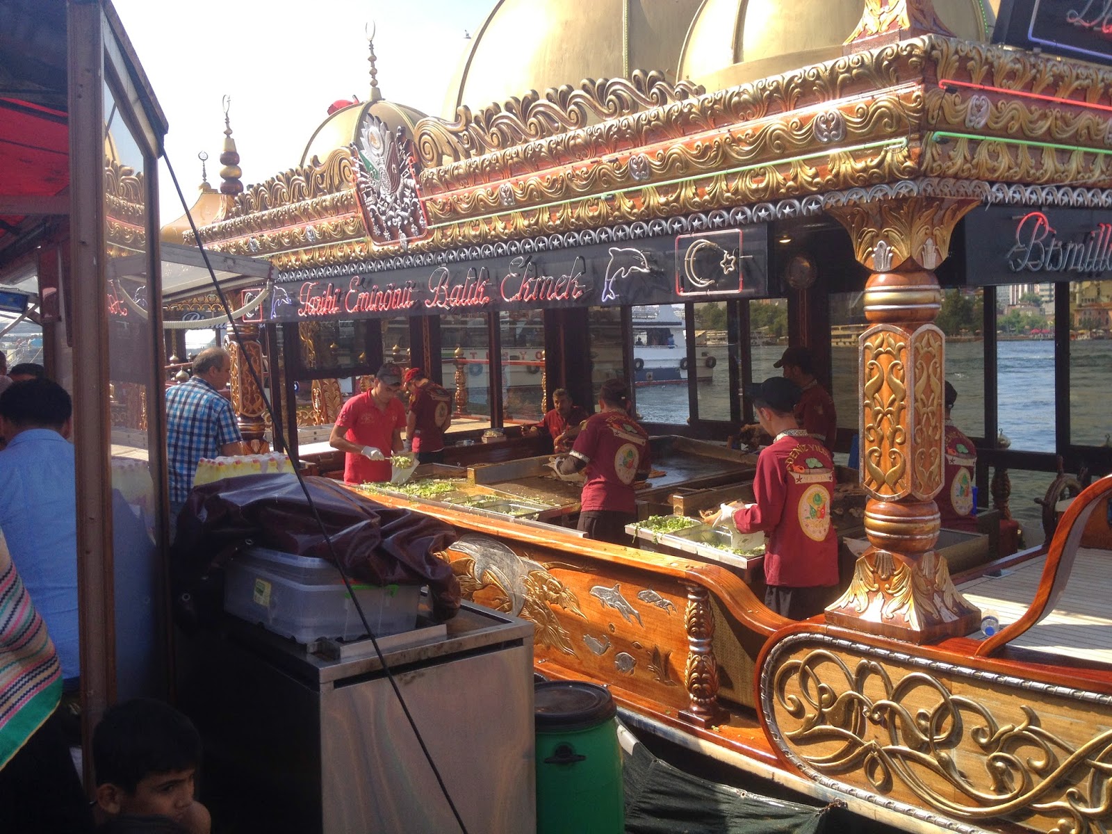 Vous retrouvez dans ce port des petits bateaux couleur or, comme vous pouvez les voir en photos en bas, qui se balancent, suivant les vagues ramenées sur la rive par les vapur. Sur ces petits bateaux, se trouvent des cuisinier, qui nous font de bons sandwichs à la salade, aux oignons et au poisson. N’ayez pas peur de sauter sur un siège, dès que vous en aurez trouvé un vide, car ces places sont rares, les restaurants sont toujours surchargés, surtout le weekend!