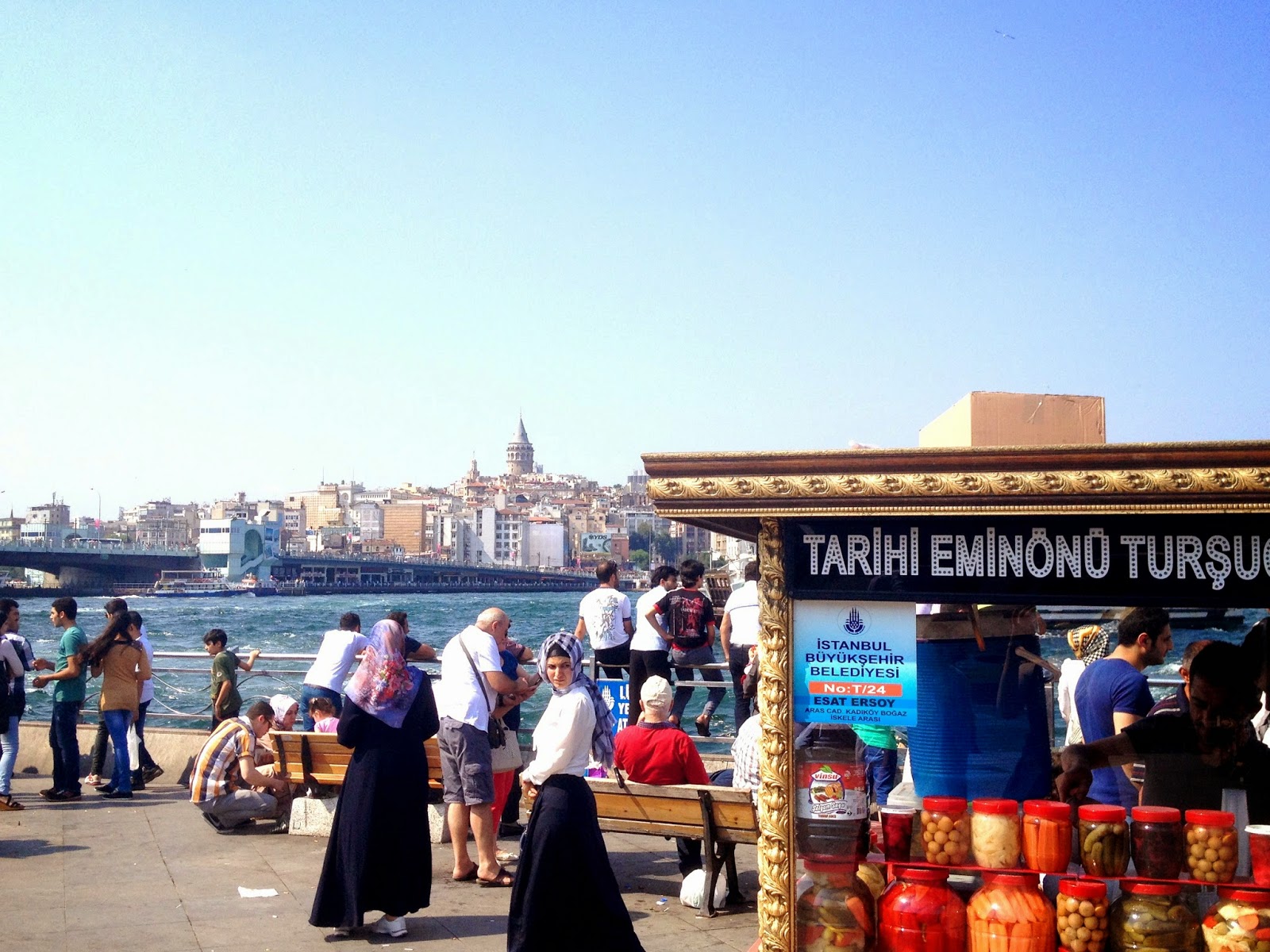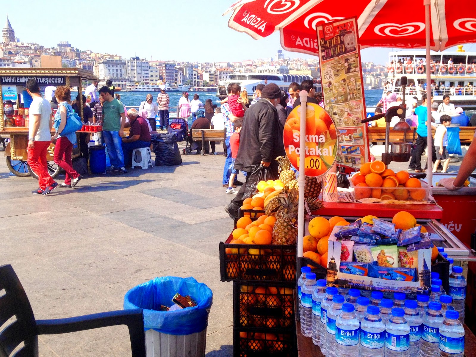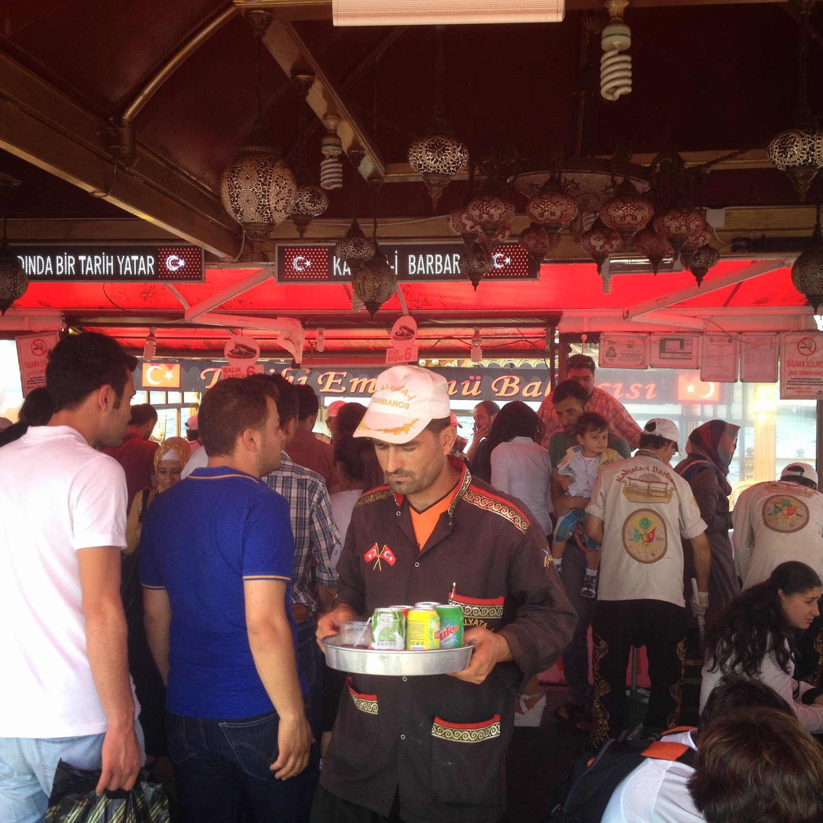 Vous retrouvez dans ce port des petits bateaux couleur or, comme vous pouvez les voir en photos en bas, qui se balancent, suivant les vagues ramenées sur la rive par les vapur. Sur ces petits bateaux, se trouvent des cuisinier, qui nous font de bons sandwichs à la salade, aux oignons et au poisson. N’ayez pas peur de sauter sur un siège, dès que vous en aurez trouvé un vide, car ces places sont rares, les restaurants sont toujours surchargés, surtout le weekend!